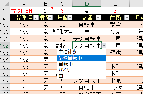 かなり凝ったアンケートですから、表面の設問は20と多いです。当然、未記入もあります。 見本は2ページにあり。 Excel使わないとクロス集計分析ができません。 グラフ化したりドキュメント作りも簡単になります。当然、分析も優れます。 ということで、Excelではデータベース入力(裏でマクロ動きます)にしてあり、図のようにドロップダウンリストが自動で開きます