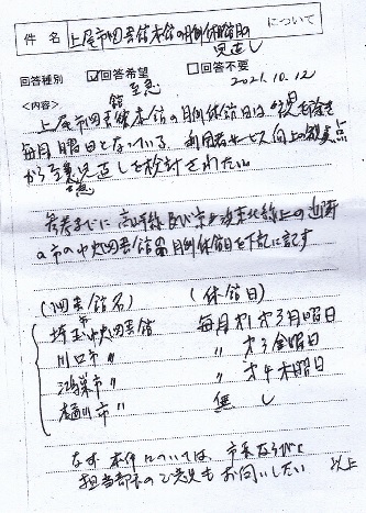 上尾市図書館利用者の方から、市長へのはがきで問題提起がありました。