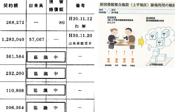 内容は、損害賠償の途中経過、及び新複合施設案の方向性です。名実ともに、島村案から畠山案に切り替わりました。その計画動機は、前任者の計画をキャンセルして本館を現在の好立地から移さない「見直し案」を建設推進勢力に賛成してもらう妥協です。